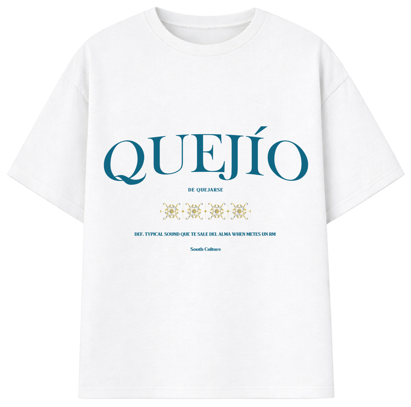 Camiseta oversize quejio, en color blanca diseñada con ese toque andaluz que nos diferencia y recordando ese sonido que nos sale del alma cuando hacemos un RM.